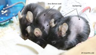 current05:58, 12 April 2026Thumbnail for version as of 05:58, 12 April 20261,355 × 781 (218 KB)KH191219 (talk | contribs)24-month-old female C57BL/6J mice with less dense coat and barbered coat. Foto: Pia Kahnau