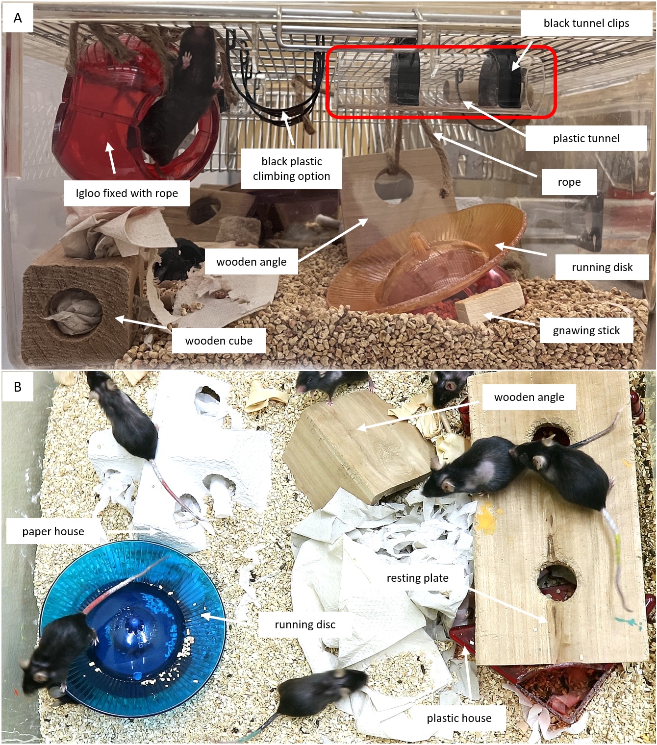 Example of an enriched cage (type IV). The home cage of the 24-month-old female mice is equipped with various structural elements such as A: wooden cube, wooden angle, climbing opportunities, B: a running disc, various houses or a resting plate. Foto: Pia Kahnau